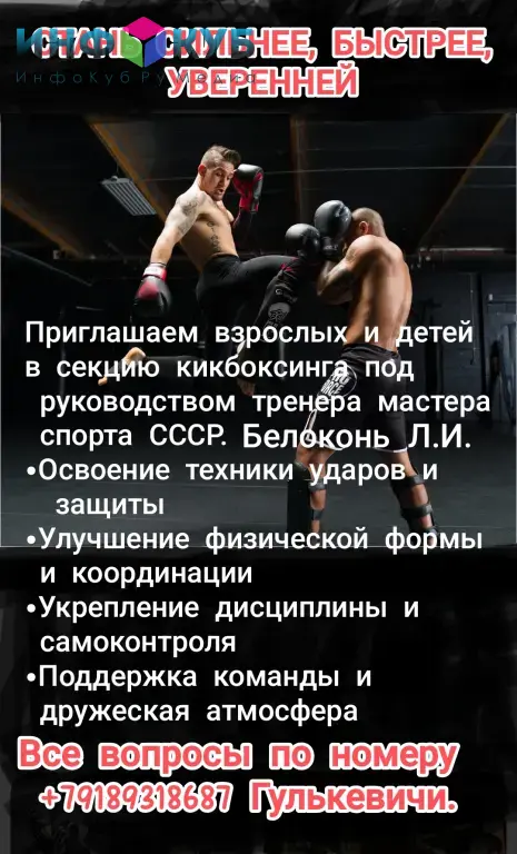Приглашаем взрослых и детей в секцию кикбоксинга. Освоение техники ударов и защиты,улучшение физической формы и координации.Укрепление дисциплины и самоконтроля, индивидуальный подход и постепенное освоение техники. Под руководством мастера спорта СССР с 30 летним стажем.Поддержка команды и дружеская атмосфера!!!